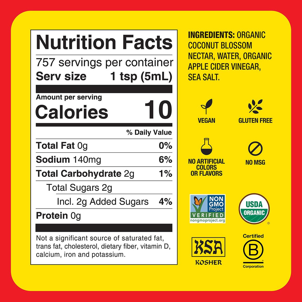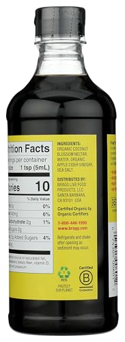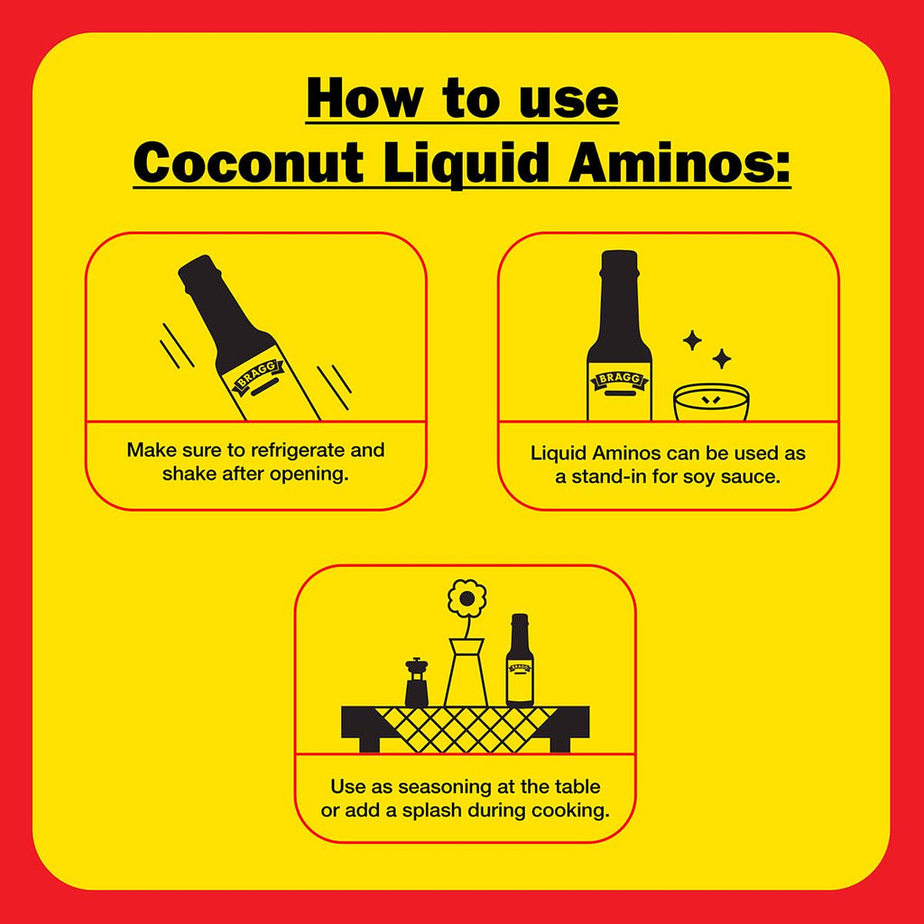 - COCONUT AMINOS: Bragg Organic Coconut Liquid Aminos is a soy-free seasoning made from organic coconut blossom nectar, world-famous Bragg apple cider vinegar, and Balinese sea salt.
