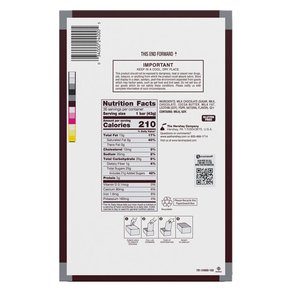 • Contains thirty six (36) 1.55-ounce HERSHEY'S Milk Chocolate Candy Bars in a bulk box