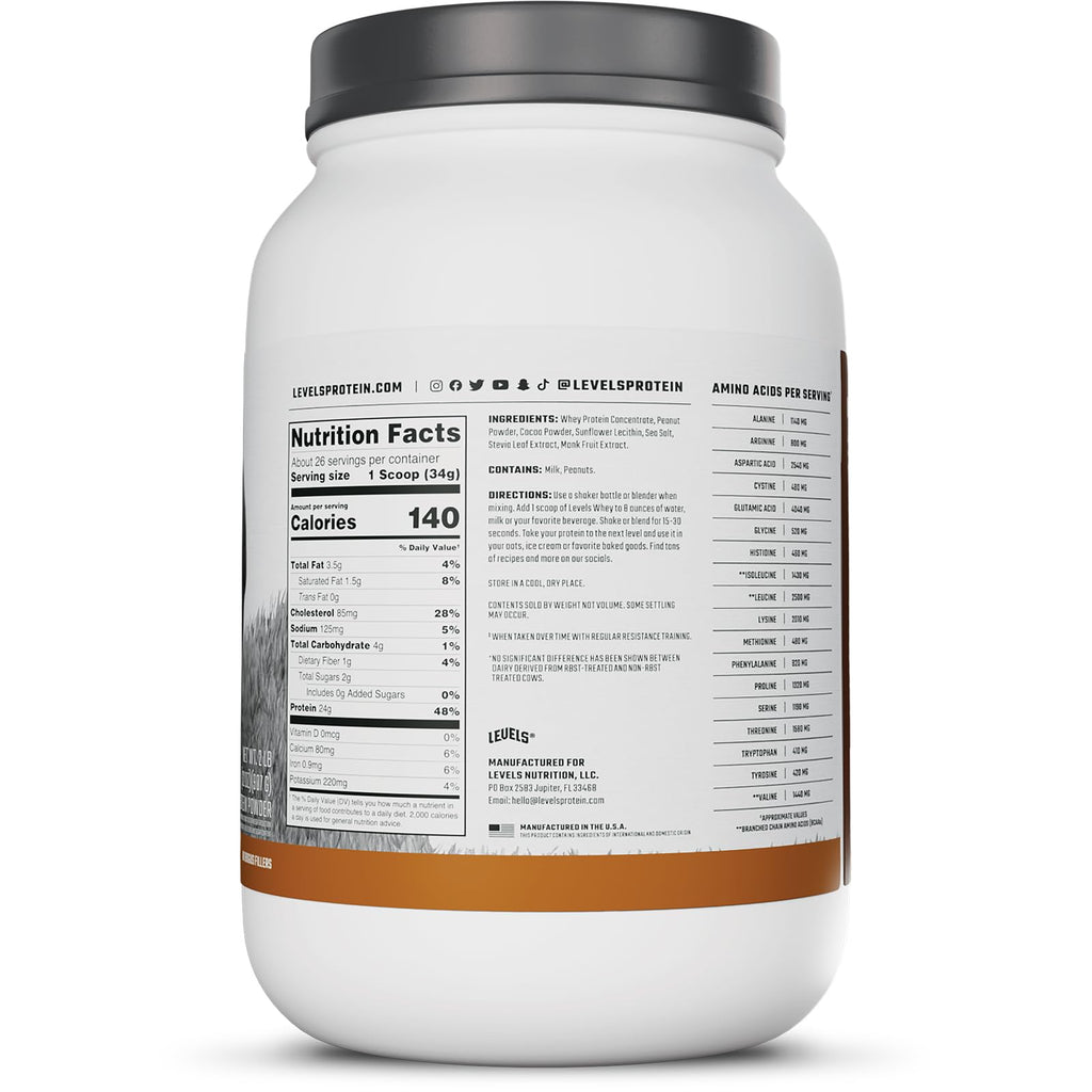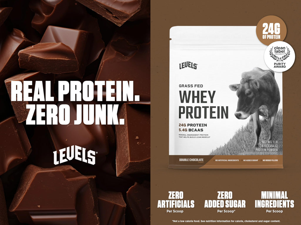 • LEVELS WHEY PROTEIN: Each scoop of Levels Double Chocolate Whey contains 24g Protein, 5.4g BCAAs (branched-chain amino acids), and no added sugars. Trusted by athletes, fitness enthusiasts and daily grinders everywhere, our whey is crafted for everyone’s lifestyle.