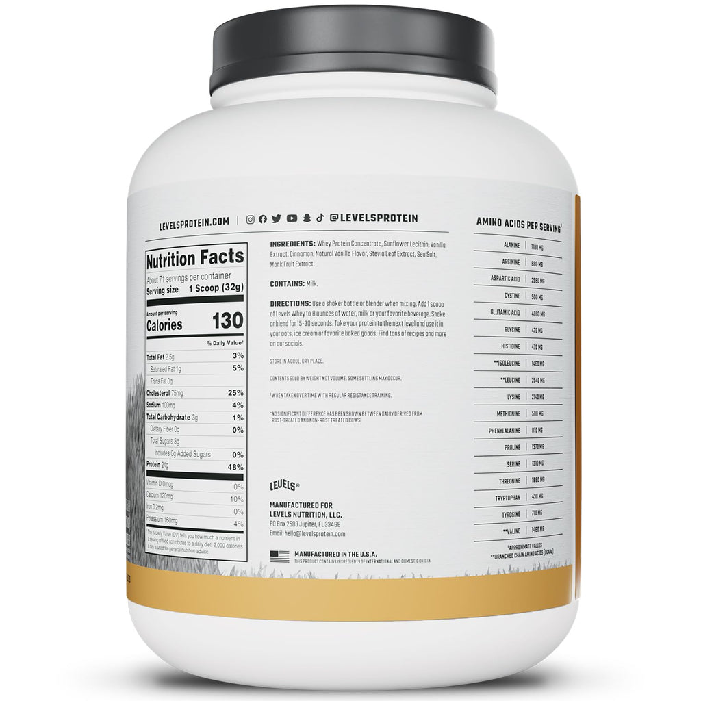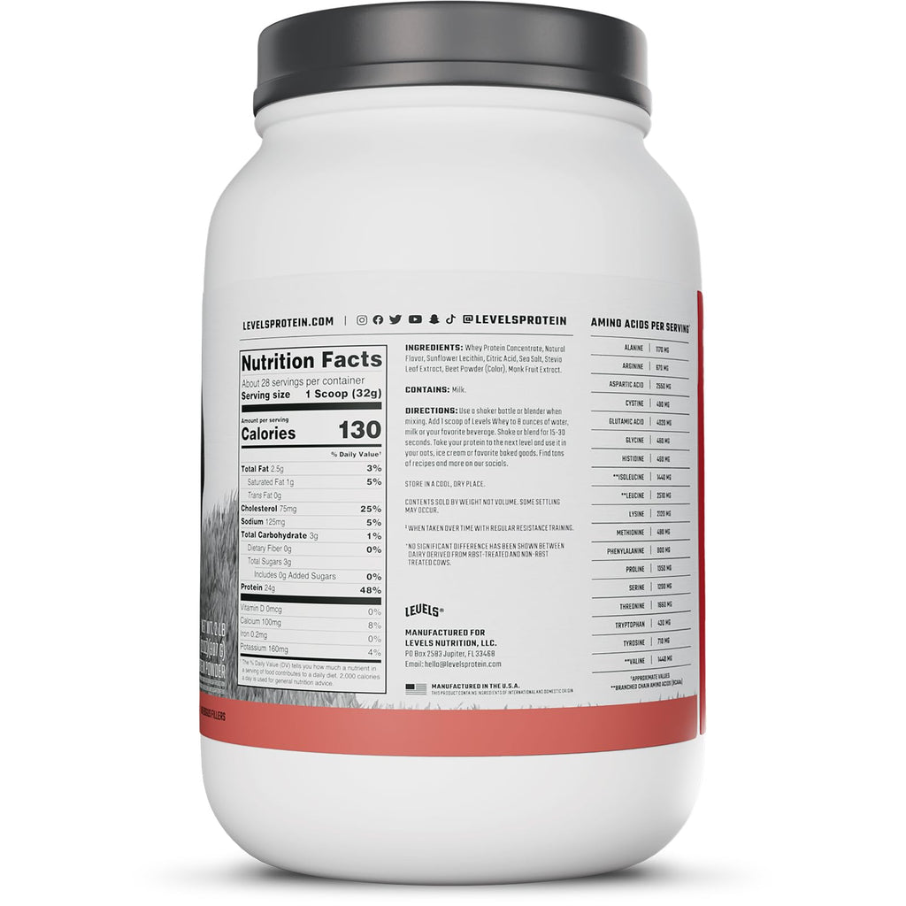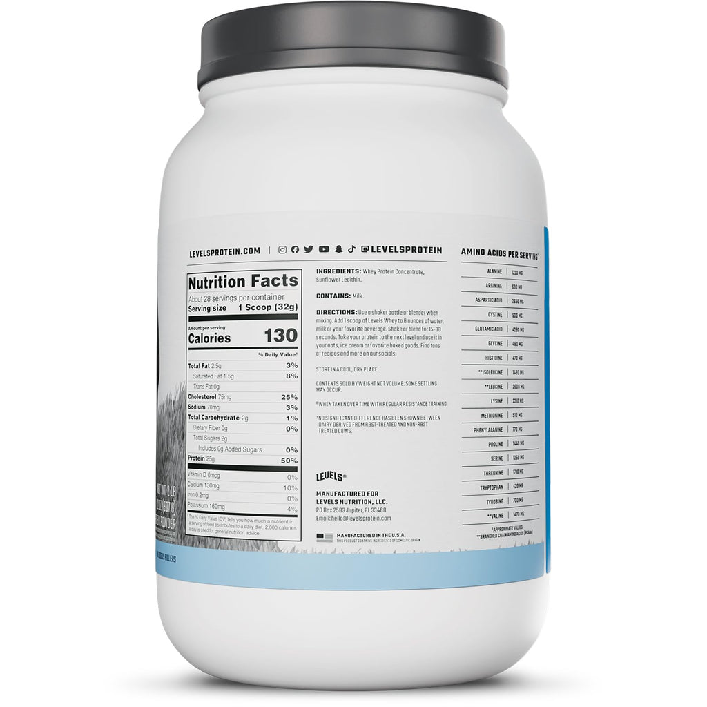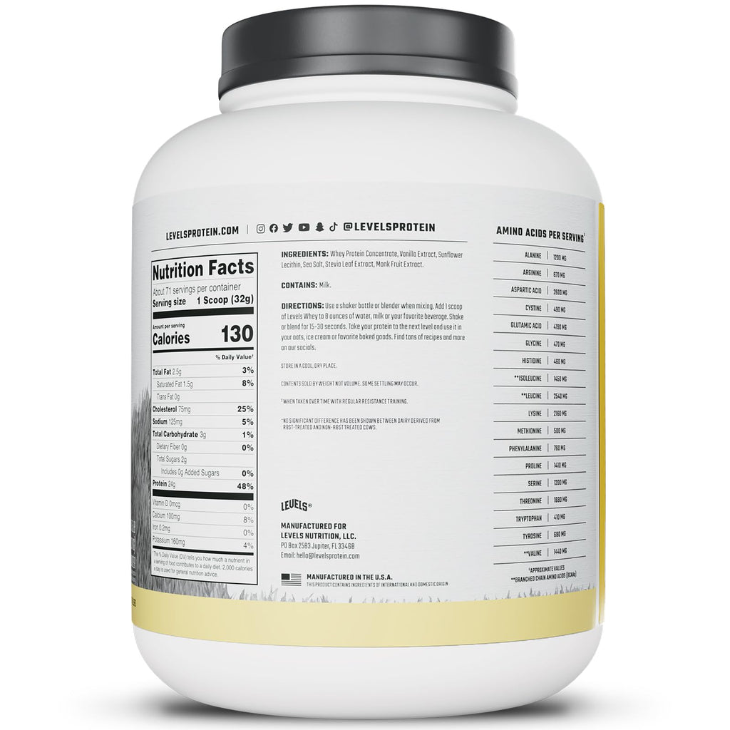 • MADE IN THE USA: Levels Whey Protein is made in the U.S.A. and is undenatured to protect bioactivity and naturally occurring growth factors. Each batch is cold-process microfiltered and blended with non-gmo sunflower lecithin for that insanely easy mixing you expect.