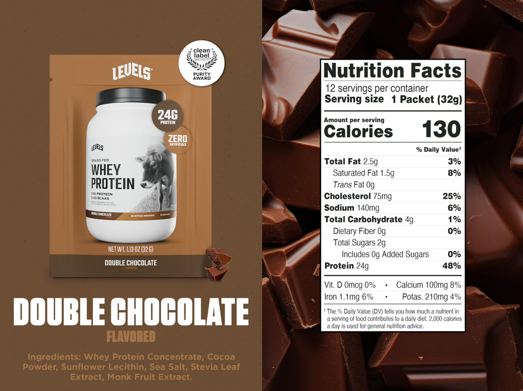 • SIMPLE & CLEAN: No fake chocolate flavor here. Levels Double Chocolate Whey is made with deliciously rich cacao and lightly sweetened with monk fruit extract.
